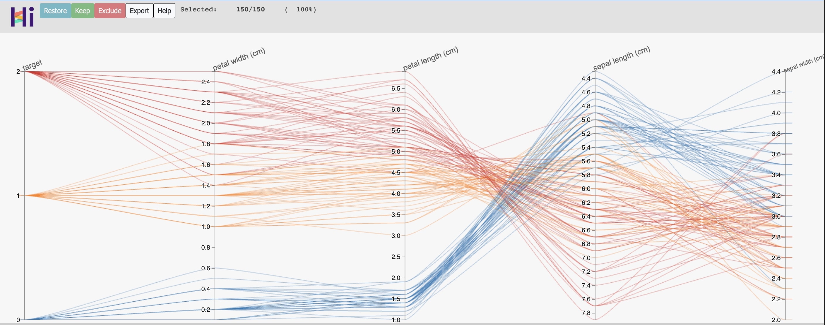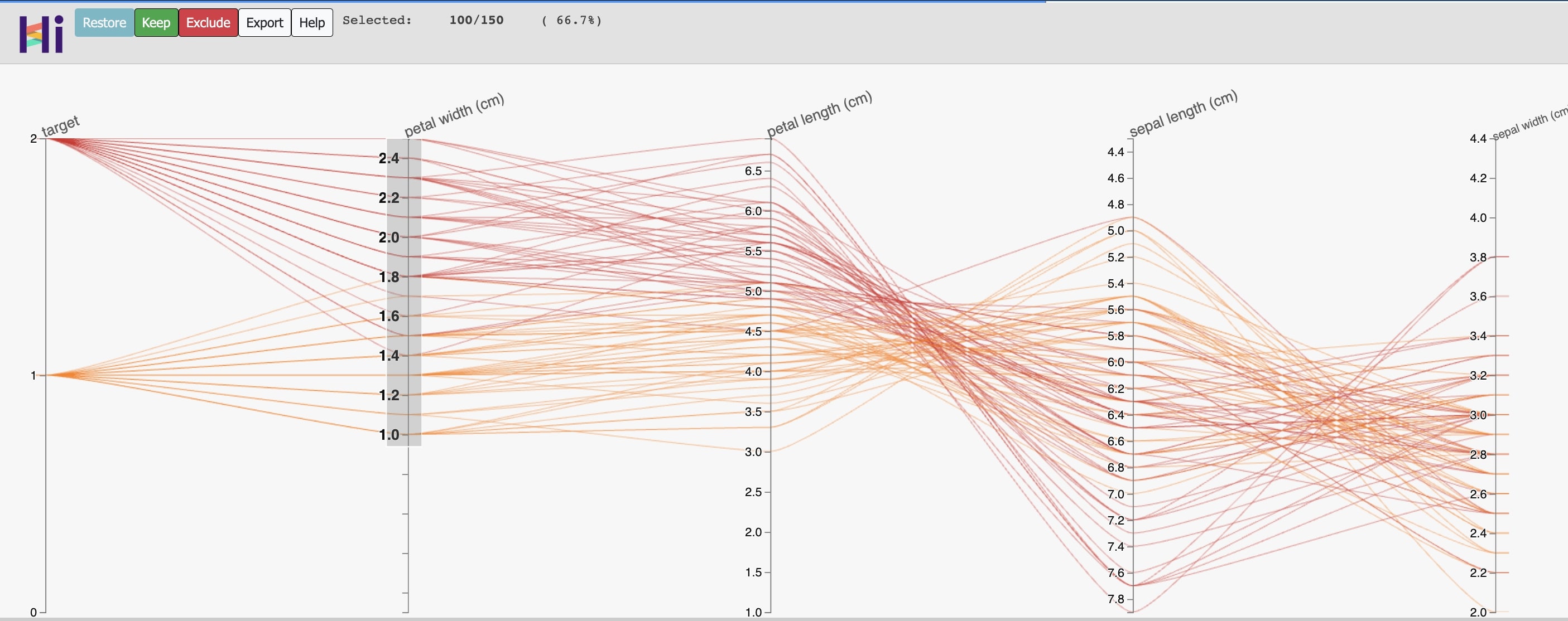 In this case there are four different dimensions and a target variable on the far left which can have three different values (0, 1 and 2). It’s now very simple to build a set of hard rules that assigns the observations to the respective class. The cool thing is that the plot is interactive which helps us exploring. It’s possible to re-order the dimensions to our liking. Also, you can focus on only a certain area of the plot by clicking and dragging around a certain range of a dimension. This will remove all the unselected lines and simplifies the plot a bit.