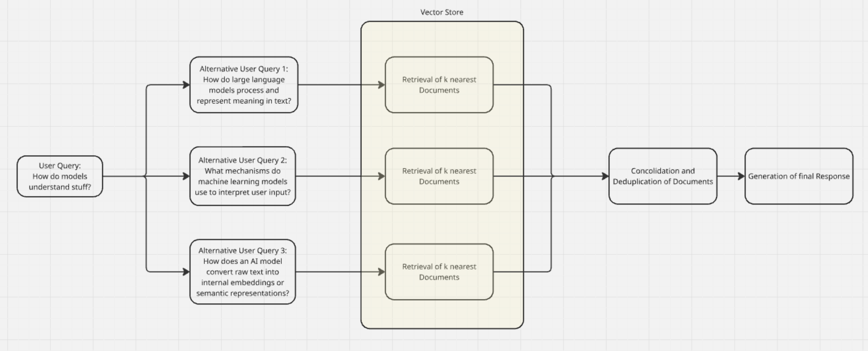 This is where query translation comes in. It basically tries to bridge the gap how information is phrased in the vector store and the way users prompt for that knowledge. The solution is quite simple: Query translation re-formulates the user question in different ways with the goal that hopefully one of the alternative formulations are closer to the content in the vector store.
